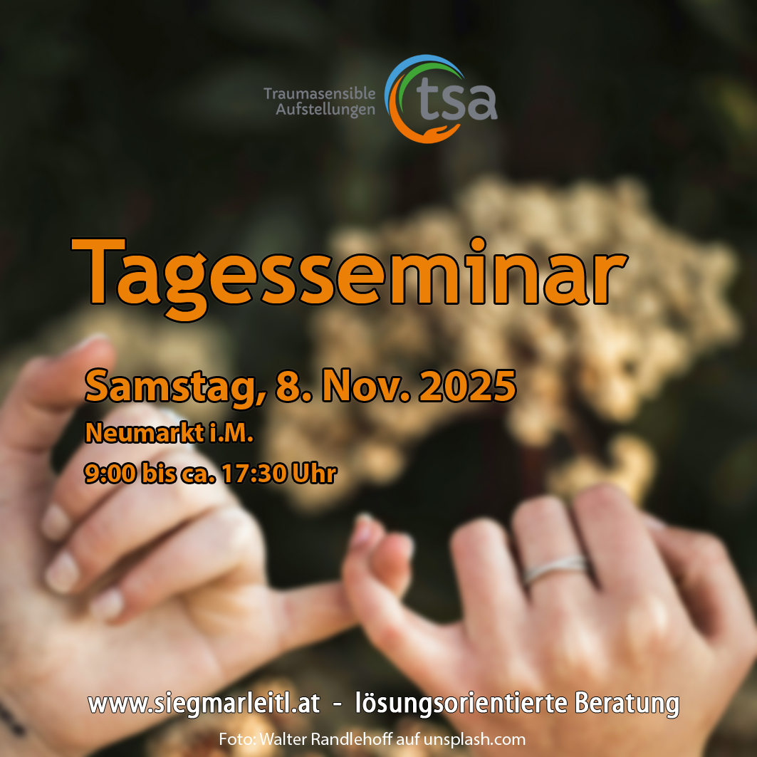 In diesem Tagesseminar werden in der Gruppe traumasensible Aufstellungen begleitet durchgeführt. Eine persönliche Anmeldung für Personen, die ein Anliegen bearbeiten wollen als auch für ResonanzgeberInnen und Interessierte, ist erforderlich.